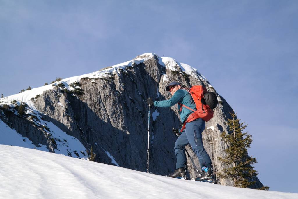 Abfahrt über die Nordrinne bis zur Forststraße und diese dann entlang bis zum Auto. Ausreichend Schnee, auf der Forststraße einzelne Schiebepassagen.