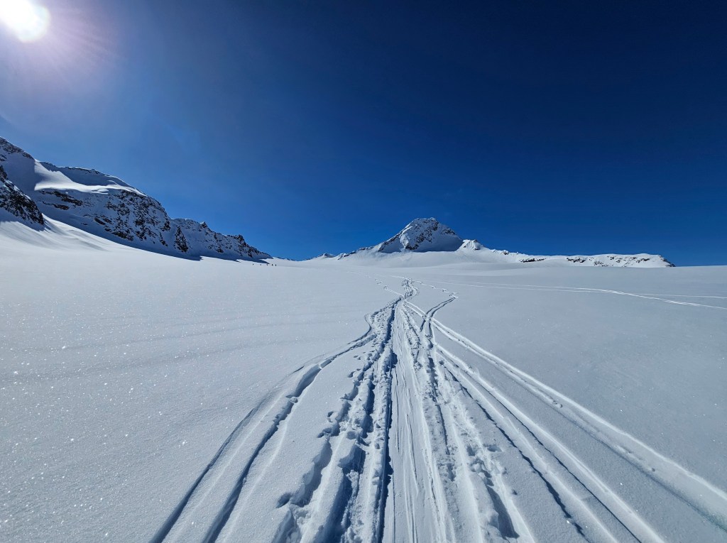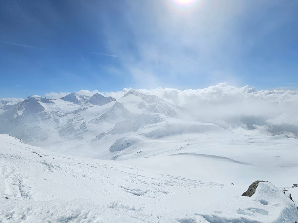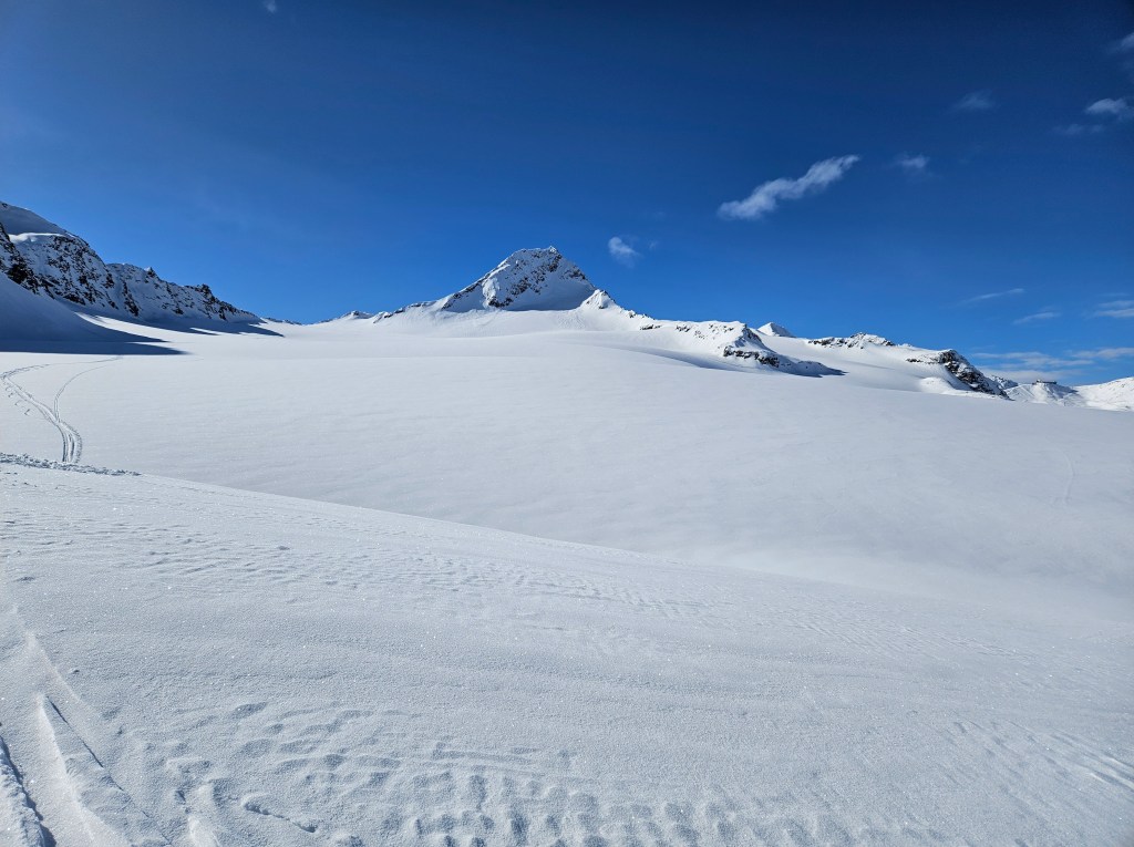 Die Abfahrt am Gletscher war top, teilweise lag noch recht weicher Schnee. Der Wiederaufstieg zum Hochjoch-Hospiz mit Skiern am Rücken war mühsam.