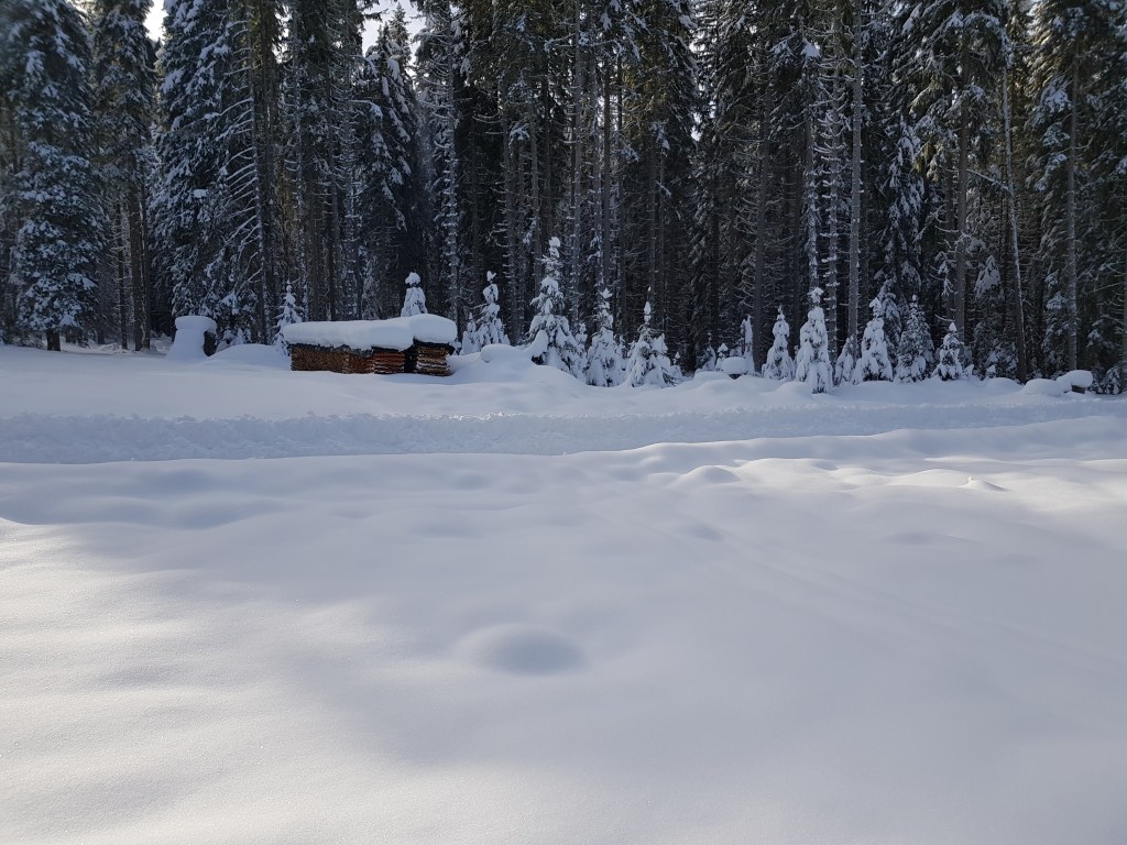 Schönes Wetter bei 30-40cm Neuschnee am Ausgangspunkt, im oberen Bereich der Tour entsprechend noch etwas mehr Neuschnee.