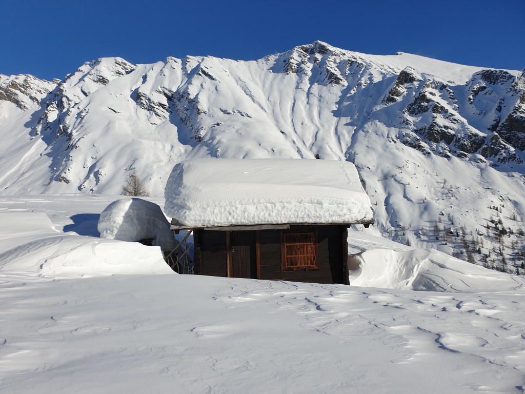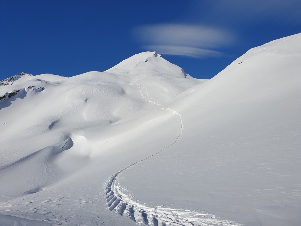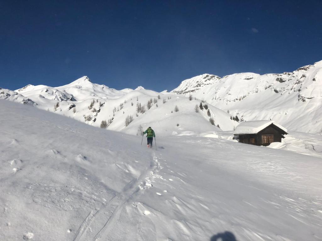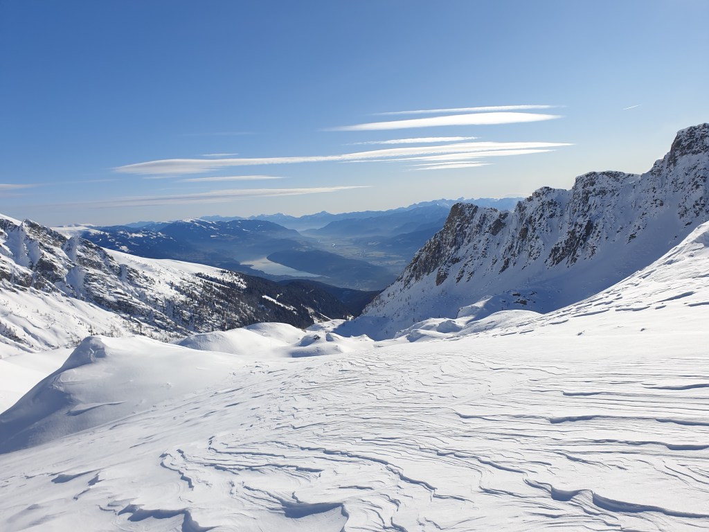 Abfahrt entlang der Aufstiegsroute. Im oberen Bereich einzelne gute Schwünge, teilweise war die Schneeoberfläche aber auch windbearbeitet. Ab der Kohlmaier Hütte zunehmend mühsam mit Tragepassagen.
