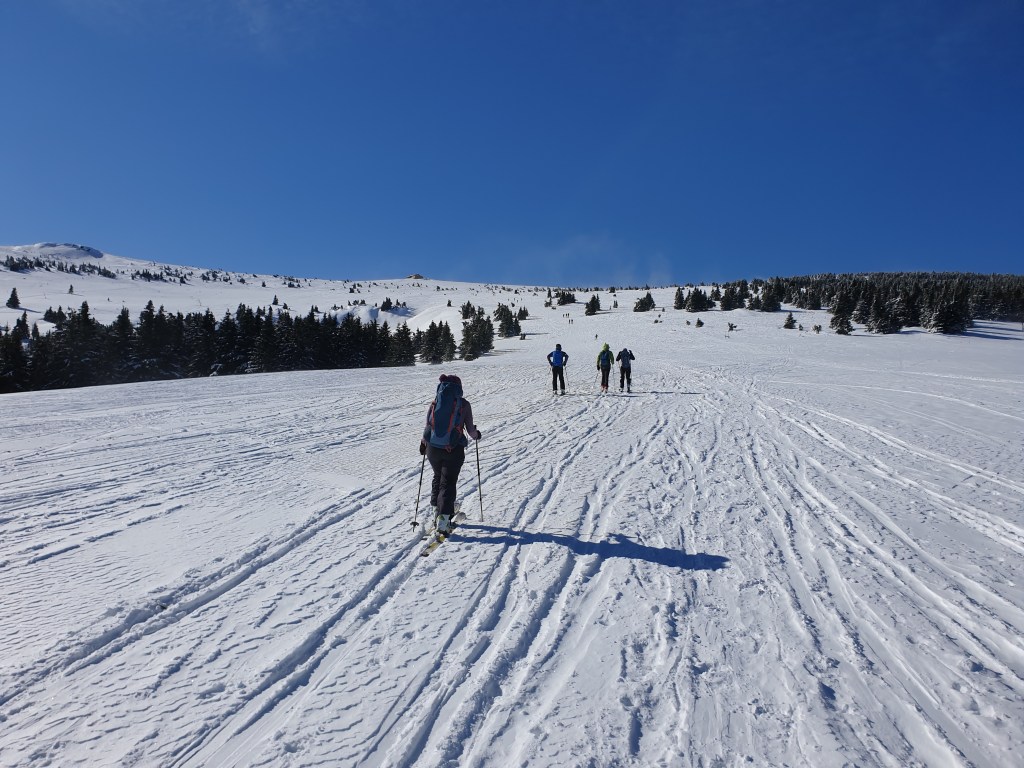 Grenzwertige Schneelage vor allem im unteren Bereich. Gerade ausreichend für den Aufstieg mit Skiern, im dichteren Wald aber teilweise auch Tragepassagen. Die Abfahrt über die Forststraße war ohne Abschnallen möglich.