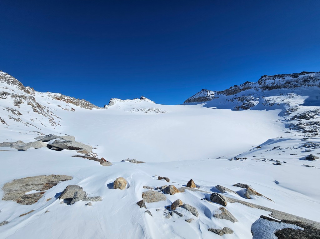 Abfahrt im oberen Bereich auf der östlichen Seite des Gletschers. Schnee leider etwas windbearbeitet. Danach Abfahrt entlang der Aufstiegsroute. Keine Unterbrecherstellen.