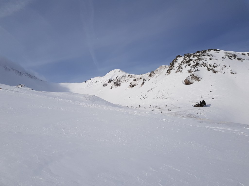 Abfahrt entlang der Aufstiegsroute. Viele Schnee, allerdings weitgehend windbearbeitet.