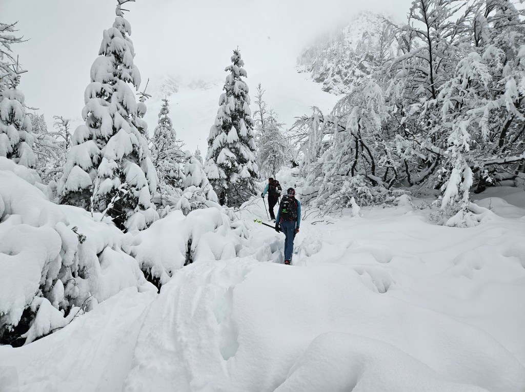 Abfahrt über die Südwestrinne bei lockerem Neuschnee bis zum Forstweg. Auch an diesem Tag war die Südwestrinne trotz stärkerer nordwestlicher Höhenströmung kaum windbeeinflusst.