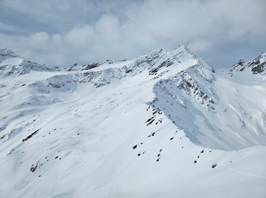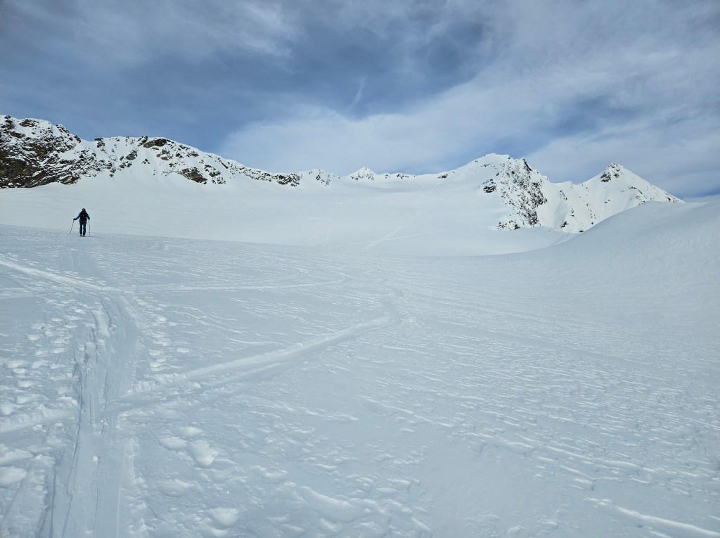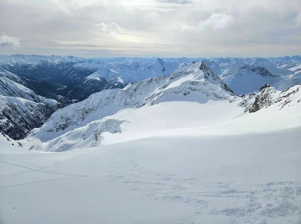 Abfahrt zu Beginn entlang der Aufstiegsroute. Am Malham Kees sehr gute Abfahrtsbedingungen mit lockerer Schneeauflage.