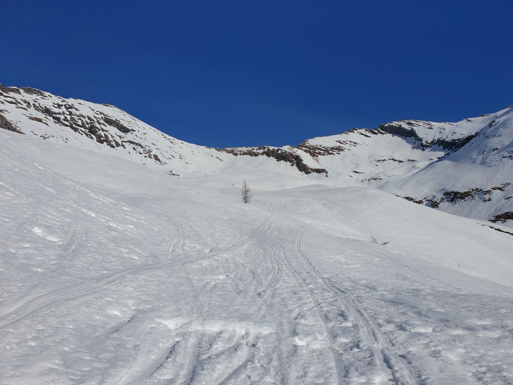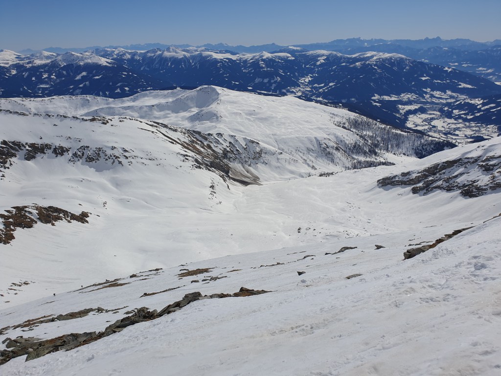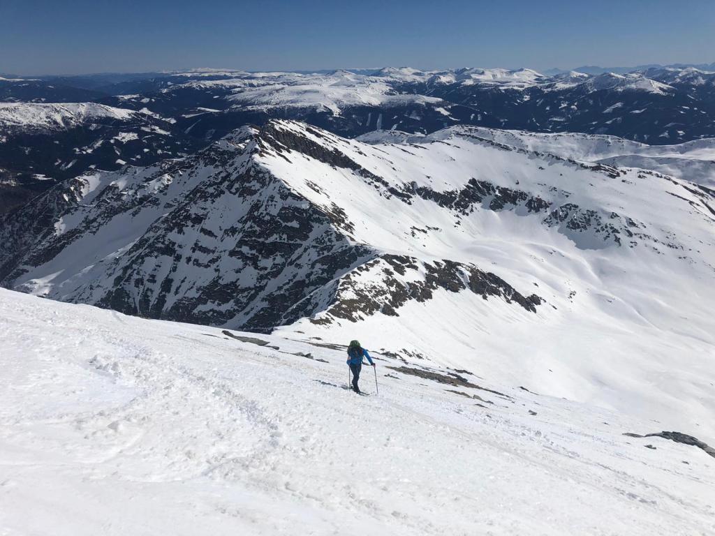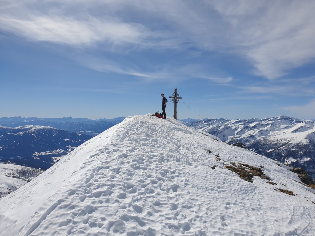 Schneelage auf der gesamten Tour sehr gut, sogar der südseitig exponierte Gipfelhang war fast vollständig mit Schnee bedeckt.