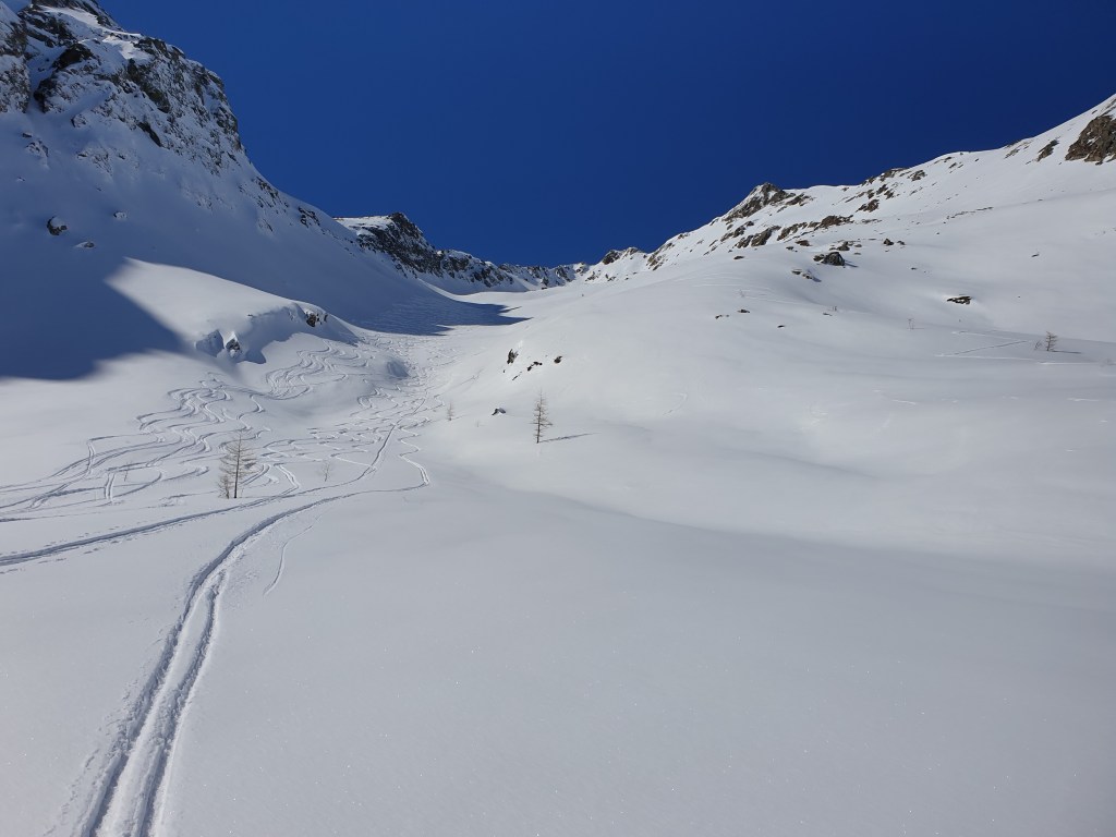 Abfahrt entlang der Aufstiegsroute, im Mittelteil sehr gut mit lockerem Neuschnee.