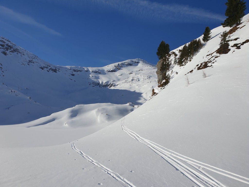 Abfahrt entlang der Aufstiegsroute. Gipfelhang gut zu fahren, weiter unten relativ flaches Gelände und einzelne Schiebepassagen. Auf der Forststraße problemlos zurück zum Auto.
