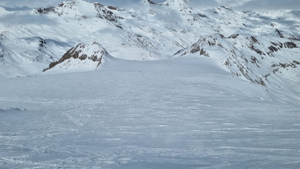 Zustieg Richtung Similaunhütte und kurz davor auf die unteren Reste des Niederjochferners. Diesen entlang bis zum Skidepot auf etwa 3500m. Die letzten Meter mit Steigeisen am Grat zum Gipfel. Spur musste getreten werden, allerdings sehr gute Bedingungen am Grat, da lockerer Schnee. Abfahrt zu Beginn über den nordwestlichen Teil des Niederjochferners, am Talboden dann entlang der Aufstiegsroute.