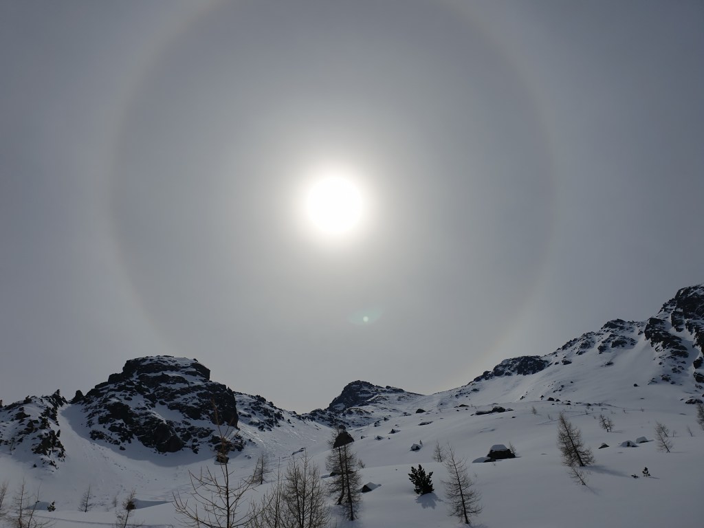 Abfahrt entlang der Aufstiegsroute. Im oberen Bereich ein paar Zentimeter lockerer Neuschnee vom Vortag, weiter unten kompakte Altschneedecke.