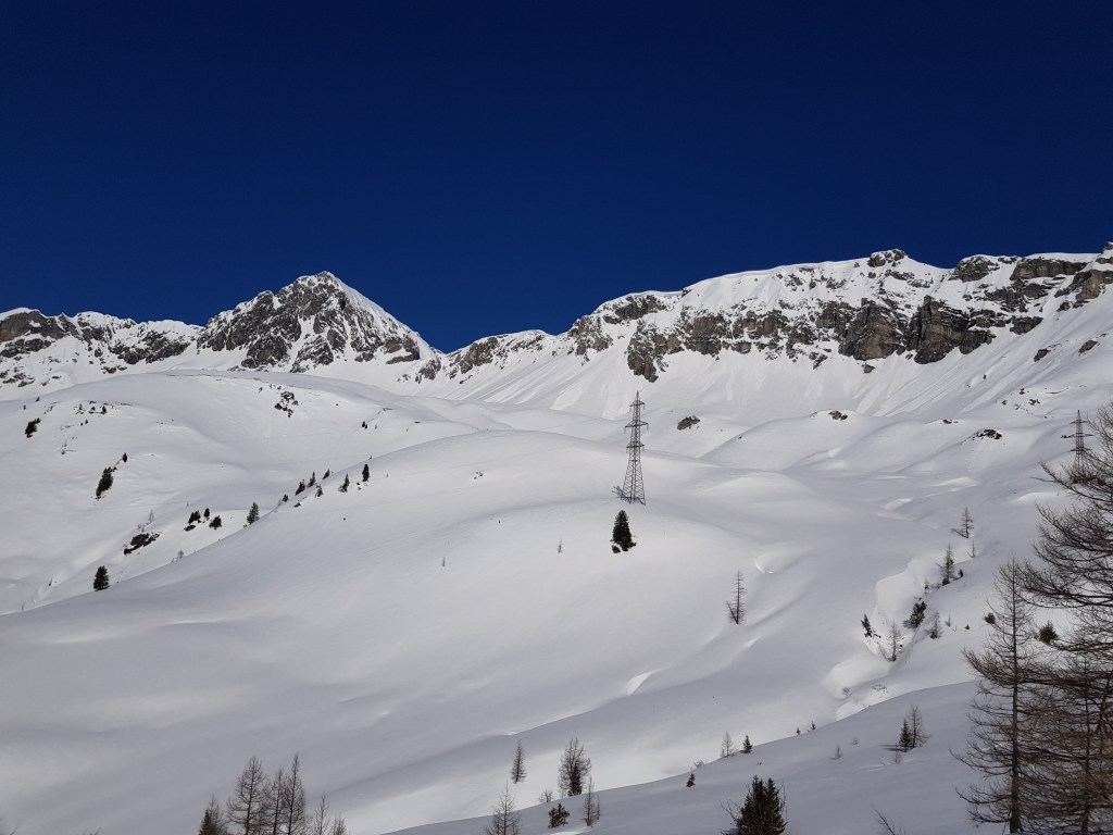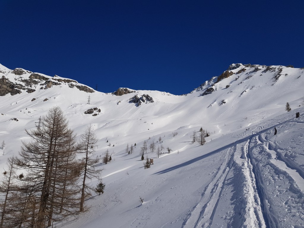 Abfahrt entlang Aufstiegsroute auf weitgehend kompakter Schneeoberfläche und ohne Unterbrecherstellen.
