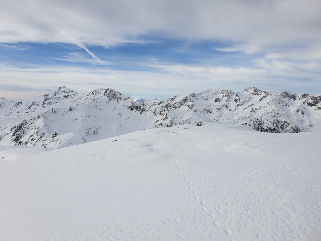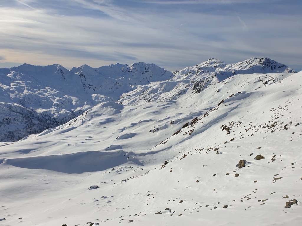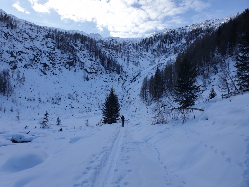 Abfahrt über Aufstiegsroute, teilweise wenig Schnee aber keine Unterbrecherstellen.