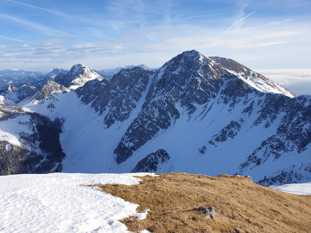 Gutes Wetter, sehr überschaubare Schneelage, vor allem im oberen Bereich des Weinaschkars. Klassische Hochnebeldecke über dem Klagenfurter Becken. Angenehm warm.