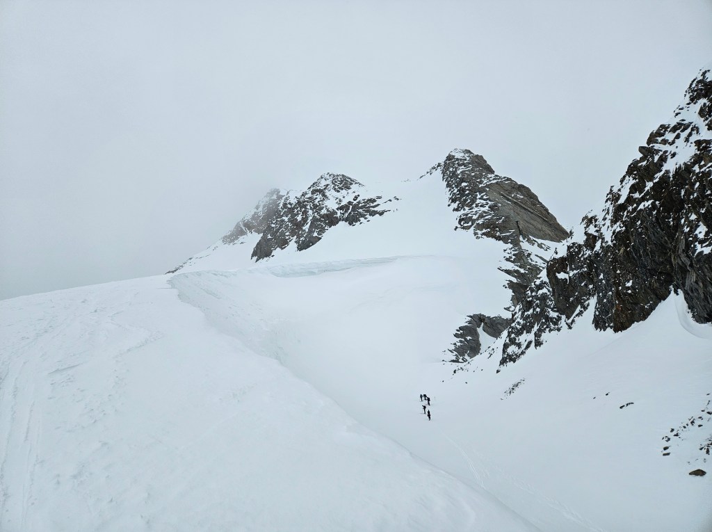 Wetter bis zum Hintereisjoch gut, Wolkenbasis in etwa 3600m. Die letzten Meter in Wolken mit beginnendem Schneefall. Gipfel leider durchwegs in Wolken. Diffuses Licht bei der Abfahrt.