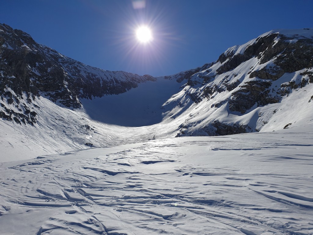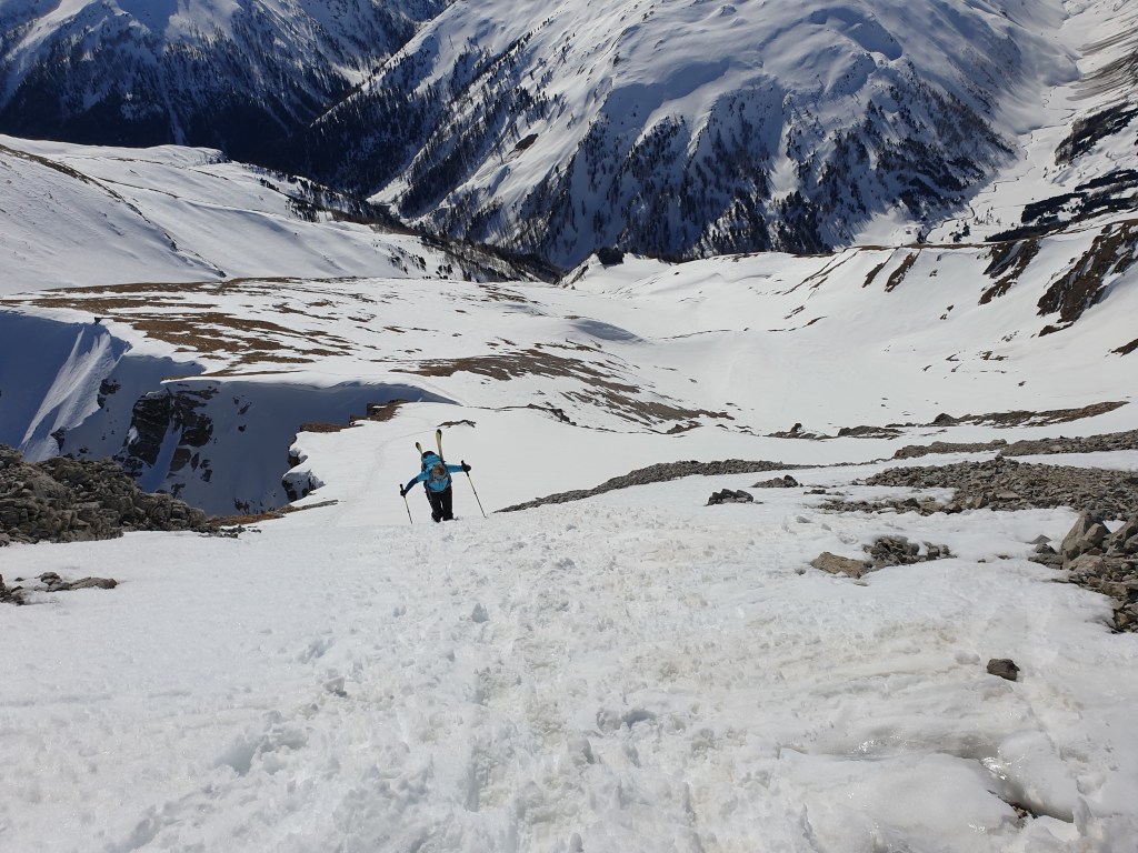 Abfahrt über das Ödenkar. Einfahrt hart aber problemlos. Im Kar selbst ebenfalls harter Schnee, im unteren Bereich einige Lawinenkegel. Im Latschengürtel oberhalb der Schliereralm teilweise wenig Schnee aber keine wirklichen Unterbrecherstellen. Von der Schliereralm etwas mühsam zurück zum parkplatz – einige Schiebepassagen.