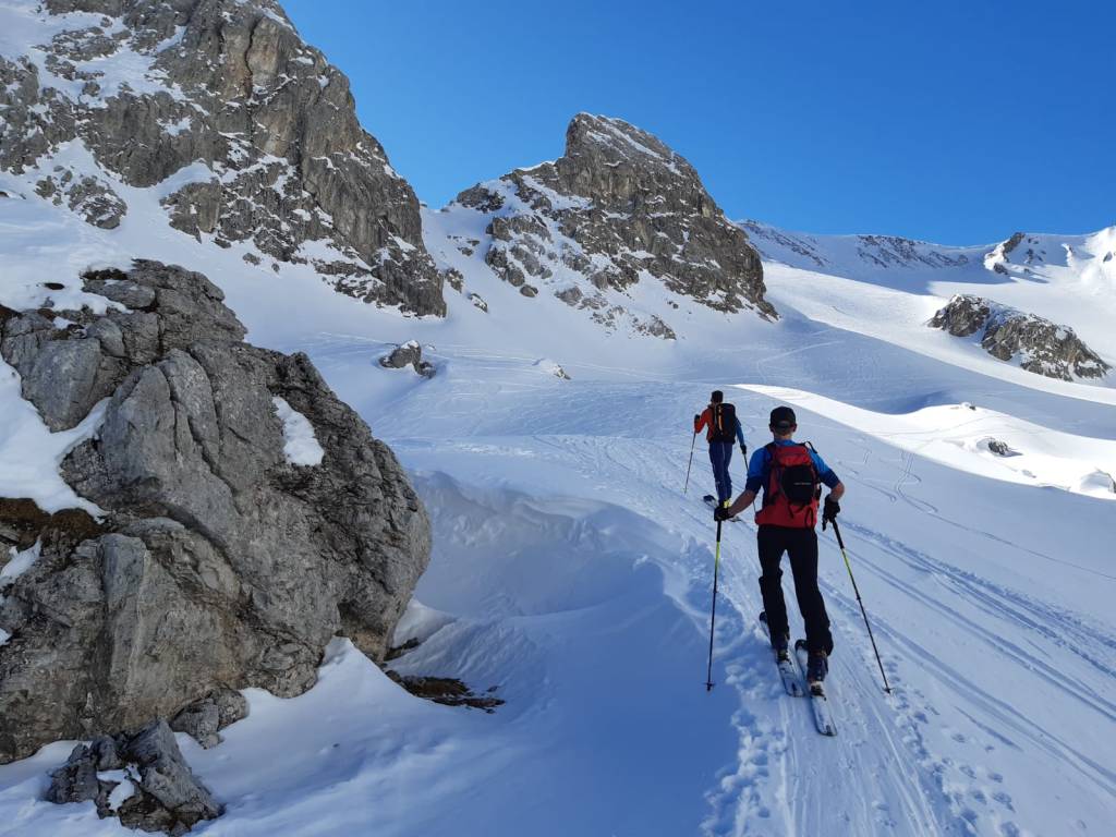 Zu Beginn steiler und teilweise glatter Aufstieg bis zu den letzten Almhütten knapp vor „der Hölle“. Weiterer Anstieg durch die Hölle und über die Westflanke auf die Felskarspitze. Am Grat entlang mit Skiern bis in die Südflanke des Weisseck. Mit Skiern am Rücken und Steigeisen zum Gipfel – guter Trittfirn in der Südflanke.