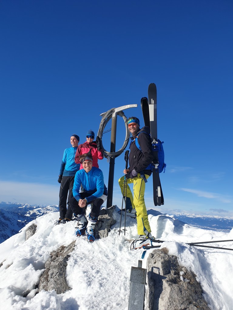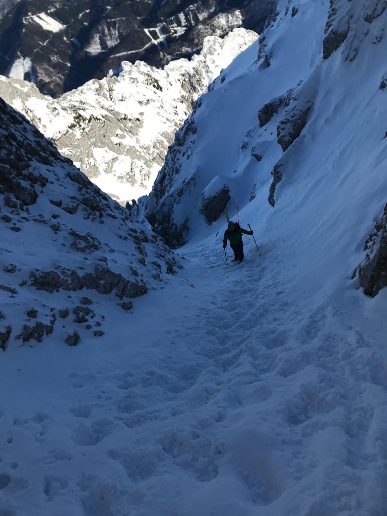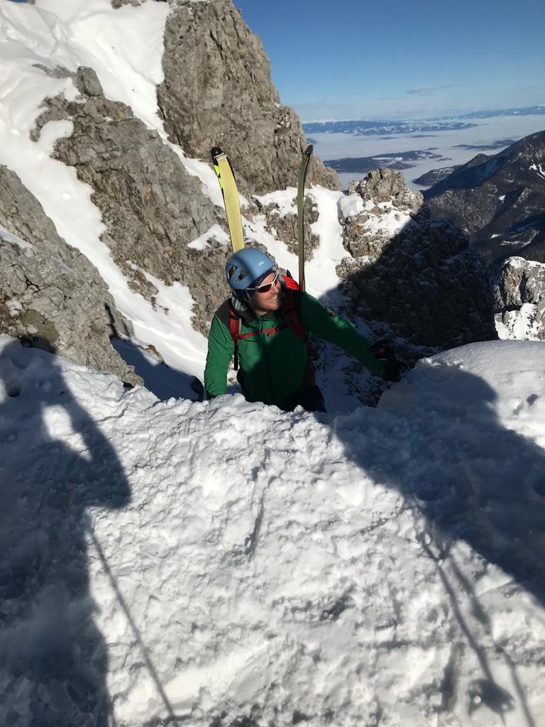 Zustieg über die Langlaufloipe Richtung Wertatschakar. Weiter über die Pautzrinne bis zur Zlebscharte. Rinne bis kurz vor Ende mit Ski begehbar, die letzten Meter in leichter Kletterei zur Scharte. Von der Scharte weiter mit Skiern zum Einstieg in die Y-Rinne. Die Rinne mit Steigeisen und Skiern am Rücken hinauf bis zum Gipfel. Bedingungen in der Rinne sehr gut – schöne Tritte und weicher Schnee.