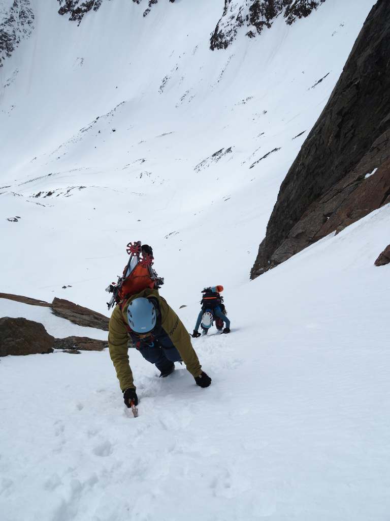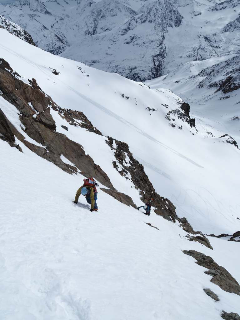 Abfahrt nach Vent etwas mühsam mit einzelnen Tragepassagen. In Vent mit Liftunterstützung bis zur Bergstation „Wildes Mannle“. In weiterer Folge kurze Abfahrt um auf den Aufstiegsweg Richtung Breslauer Hütte zu gelangen. Über die Reste des Mitterkarferners bis zum Einstieg in den Klettersteig Richtung Taschachferner. Die Rinne neben dem Klettersteig war leider keine Alternative, da unangenehme Unterbrecherstelle im Mittelteil aufgrund von wenig Schnee, zudem teilweise vereist. Seilversicherungen im unteren Bereich des Steigs frei, im oberen Bereich eingeschneit, somit Aufstieg mit Pickel und Steigeisen. Weiter am Taschachferner zur allgemeinen Aufstiegsroute. Skidepot auf knapp 3700m sehr gut besucht. Die letzten Meter mit Steigeisen am Grat zum Gipfelkreuz.