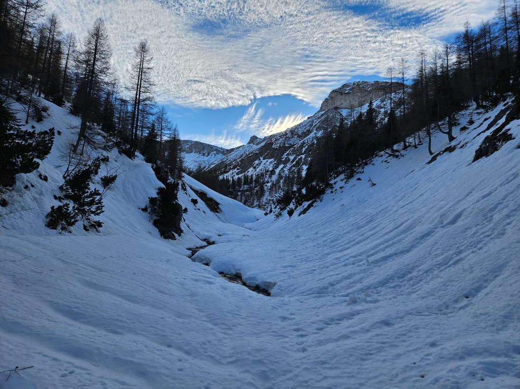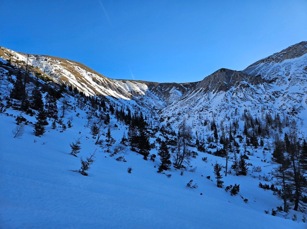 Tour an der Nordseite der Schneealpe. Zustieg zu Beginn entlang der Forststraße, dann Abzweigung entlang des Kleinbodenbachs. Entlang des Wanderwegs lange mit Skiern am Rücken bis auf Höhe der Donnerwand. Weiter mit Skiern über den Melkboden bis zum Schusterstuhl. Die letzten Meter am aperen Gipfelgrat zu Fuß zum Gipfelkreuz.