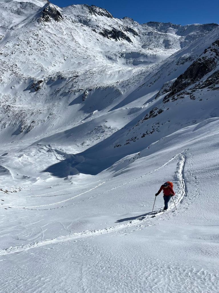 Hochdrucklage mit Zufuhr von trockener Luft. In unteren Schichten leichter Südföhngradient. Im Tal beständiger Gegenwind, der die Spur vom Vortag komplett zugeweht hat. Entsprechend mühsam die Spuranlage. Insgesamt sehr wenig Schnee.